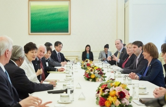 ¡¸Æç·Î½Ã¡¹ ´ëÇ¥´Â ÃÖ±Ù ÇÑ·ÀÏ·Áß 3±¹ ¿Ü±³Àå°üȸÀÇÀÇ ¼º°øÀûÀÎ °³ÃÖ¸¦ ÃàÇÏÇÏ¿´½À´Ï´Ù. ¹Ú ´ëÅë·ÉÀº ÀÌ¿¡ ´ëÇØ °¨»çÇϰí, µ¿ºÏ¾ÆÀÇ ÆòÈ­ ¾ÈÁ¤À» À§ÇØ, ƯÈ÷, ±Ý³â ÇÑ·ÀÏ ±¹±³ Á¤»óÈ­ 50ÁÖ³â, ±¤º¹ 70ÁÖ³âÀ» ¸Â¾Æ ÇÑ·ÀÏ °ü°è¸¦ ¹ßÀü½ÃÄÑ ³ª°¡±â À§ÇÑ ¿ì¸®ÀÇ ³ë·ÂÀ» ¼³¸íÇß´Ù.