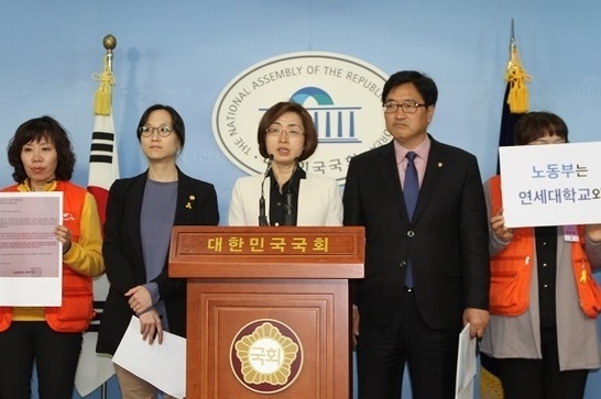 ¿¬¼¼´ëÇб³ ¼ÛÅäÄ·ÆÛ½º ±â¼÷»ç û¼Ò¿Í °æºñ ¾÷¹«¸¦ ¸Ã°í ÀÖ´Â ±Ù·ÎÀÚµéÀº 22ÀÏ ±¹È¸ Á¤·Ð°üÀ» ã¾Æ »õÁ¤Ä¡¹ÎÁÖ¿¬ÇÕ À»Áö·ÎÀ§¿øÈ¸(À§¿øÀå ¿ì¿ø½Ä) ¼Ò¼Ó ÀÇ¿øµé°ú ÇÕµ¿À¸·Î ±âÀÚȸ°ßÀ» ¿°í ‘°í¿ë³ëµ¿ºÎ´Â ¿¬¼¼´ëÇб³ ¹× ¿ë¿ª¾÷ü¿¡ ´ëÇÑ Æ¯º°±Ù·Î°¨µ¶À» ½Ç½ÃÇ϶ó!’°í Ã˱¸Çß´Ù.