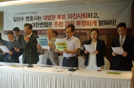¹Ù¸¥»çȸ½Ã¹ÎȸÀÇ, ÀÚÀ¯¿ÍÅëÀÏÀ»ÇâÇѺ¯È£»ç¿¬´ë(ÀÚº¯), ÀÚÀ¯¹ÎÁÖ¿¬±¸ÇÐȸ µî 60°³ ´Üü´Â 16ÀÏ ‘±è¼±¼ö º¯È£»ç ´ë¹ý°ü Èĺ¸ ÀÚÁø»çÅð Ã˱¸ ±âÀÚȸ°ß’À» ÅëÇØ “´ë¹ý°ü Èĺ¸ ´ë»óÀÌ µÇ·Á¸é ´ë¹ý°üÀ¸·Î¼ °¡Á®¾ß ÇÒ ¹ýÀǽİú ´ëÇѹα¹¿¡ ´ëÇÑ Á¤Ã¼¼ºÀÌ È®°íÇØ¾ß ÇÑ´Ù”°í ¸ñ¼Ò¸®¸¦ ³ô¿´´Ù.