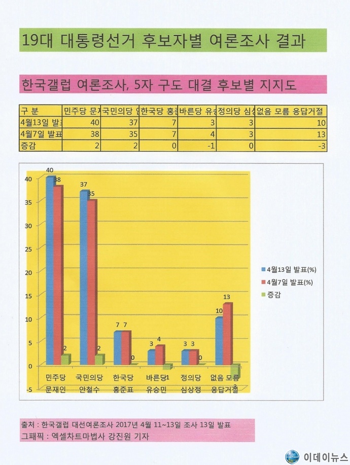 ¿©·ÐÁ¶»ç¾÷ü Çѱ¹°¶·´ÀÌ Áö³ 11~13ÀÏ Àü±¹ ¼ºÀÎ 1010¸íÀ» ´ë»óÀ¸·Î Á¶»çÇØ 13ÀÏ ¹ßÇ¥ÇÑ ¿©·ÐÁ¶»ç°á°ú °¢ Èĺ¸º° ÁöÁöÀ²¿¡ µû¸£¸é ´õºÒ¾î¹ÎÁÖ´ç ¹®ÀçÀÎ Èĺ¸ 40%, ±¹¹ÎÀÇ´ç ¾Èö¼ö Èĺ¸ 37%·Î Áö³ÁÖ 7ÀÏ ¹ßÇ¥º¸´Ù µÎ Èĺ¸ ¸ðµÎ °¢°¢ 2% »ó½ÂÇÑ °ÍÀ¸·Î Á¶»çµÇ¾ú´Ù.